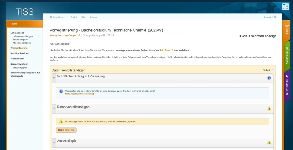 Bei der Vorregistrierung registrierst du dich zuerst für einen Guest-Account. Du erhältst rasch ein E-Mail mit einem Link zur Bestätigung der E-Mail Adresse. Mit dem Account kannst du nun auf der Seite der Aufnahmeverfahren das Technische Chemie Studium auswählen. Im Bereich der Vorregistrierung kannst du nun deine Daten angeben. Solltest du Probleme im Prozess haben, kannst du dich an die Studienabteilung wenden.